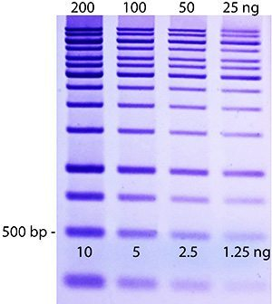 1 kb DNA ladder loaded on a 1% agarose gel in two-fold dilutions. The gel was stained with DNAzure® Blue Nucleic Acid Gel Stain.