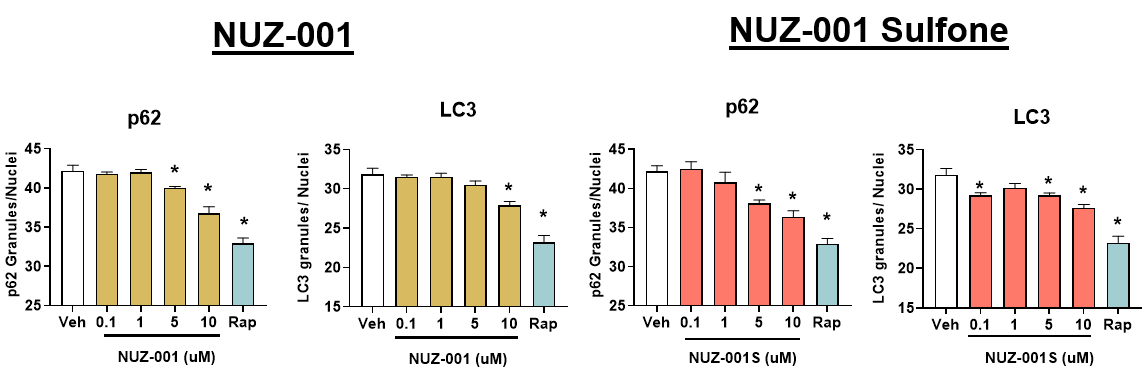 Figure 1: NUZ-001 and NUZ-001 Sulfone decrease p62 and LC3 protein levels in human iPSC-derived neurons. Immunoreactivity of p62 and LC3 was quantified and normalized to total number of nuclei. * p<0.05 vs vehicle (Veh) control using a one-way ANOVA with Dunnett’s post hoc analysis. Rapamycin (Rap) was used as a positive control for autophagy activation