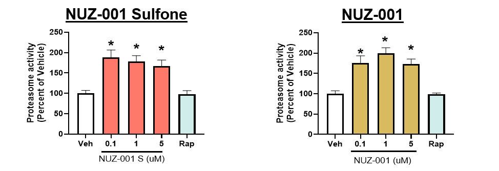 Figure 2: NUZ-001 and NUZ-001 Sulfone increase proteasomal activity in human iPSC-derived neurons. Proteasomal activity was measured using the Proteasome GloTM assay and activity normalized to vehicle control. *p<0.05 vs vehicle (Veh) control using a one-way ANOVA with Dunnett’s post hoc analysis. Rapamycin (Rap) was used as a comparator.